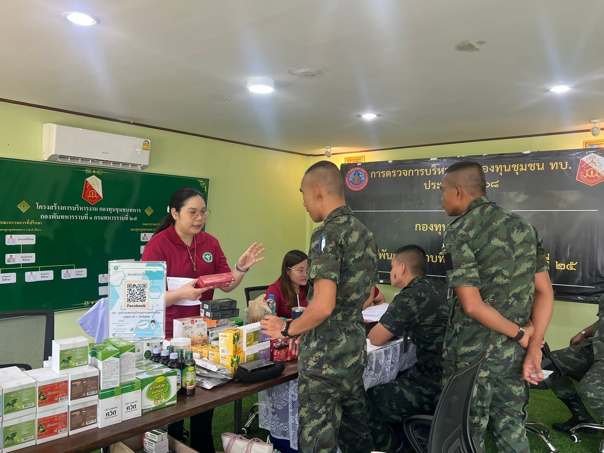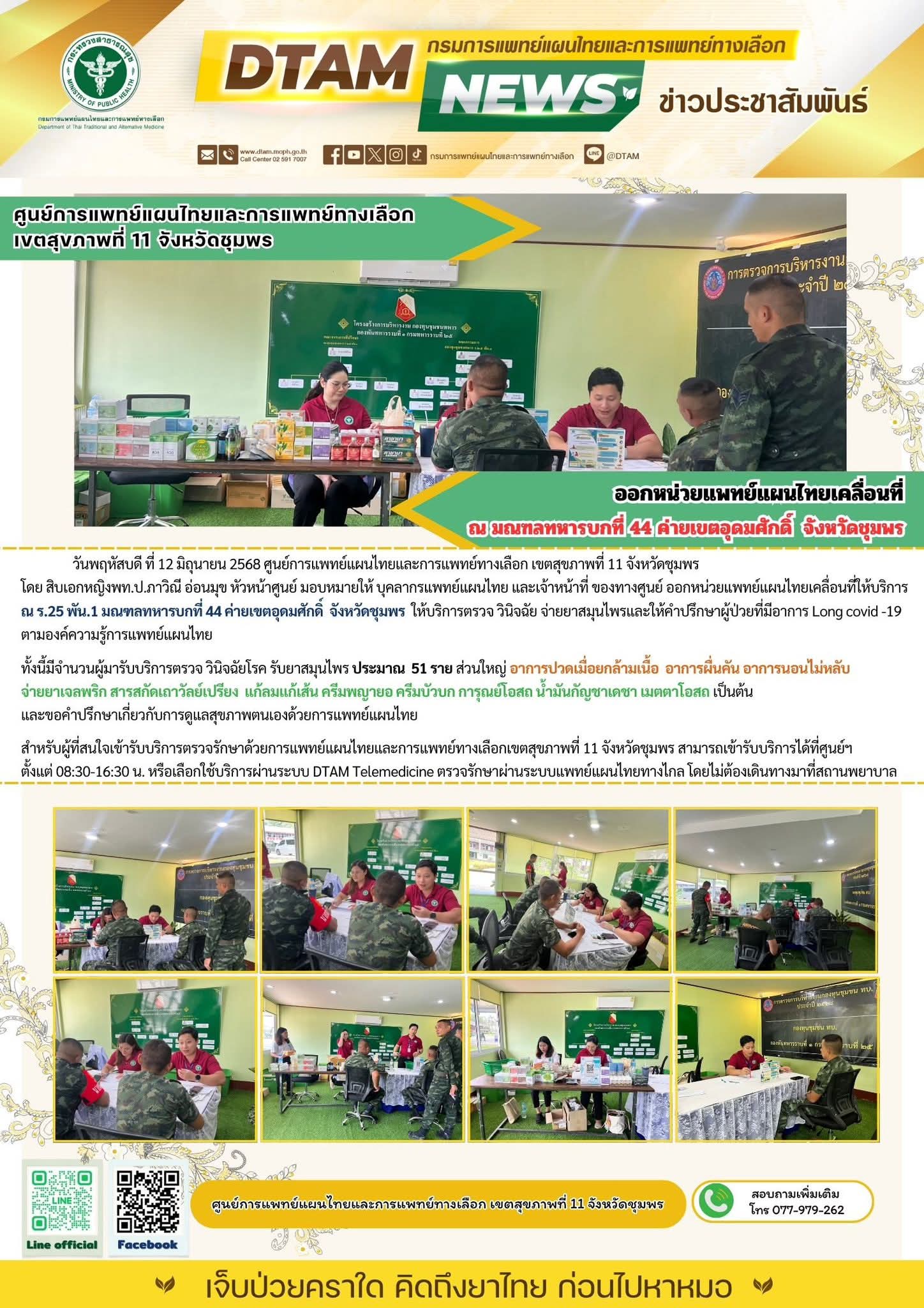 วันพฤหัสบดี ที่ 12 มิถุนายน 2568 ศูนย์การแพทย์แผนไทยและการแพทย์ทางเลือก เขตสุขภาพที่ 11 จังหวัดชุมพร โดย สิบเอกหญิงพท.ป.ภาวิณี อ่อนมุข หัวหน้าศูนย์ มอบหมายให้ บุคลากรแพทย์แผนไทย และเจ้าหน้าที่ ของทางศูนย์ ออกหน่วยแพทย์แผนไทยเคลื่อนที่ให้บริการ ณ ร.25 พัน.1 ค่ายเขตอุดมศักดิ์ จังหวัดชุมพร ให้บริการตรวจ วินิจฉัย จ่ายยาสมุนไพรและให้คำปรึกษาผู้ป่วยที่มีอาการ Long covid -19 ตามองค์ความรู้การแพทย์แผนไทย ทั้งนี้มีจำนวนผู้มารับบริการตรวจ วินิจฉัยโรค รับยาสมุนไพร ประมาณ 51 ราย ส่วนใหญ่ อาการปวดเมื่อยกล้ามเนื้อ อาการผื่นคัน อาการนอนไม่หลับ จ่ายยาเจลพริก สารสกัดเถาวัลย์เปรียง แก้ลมแก้เส้น ครีมพญายอ ครีมบัวบก การุณย์โอสถ น้ำมันกัญชาเดชา เมตตาโอสถ เป็นต้น และขอคำปรึกษาเกี่ยวกับการดูแลสุขภาพตนเองด้วยการแพทย์แผนไทย