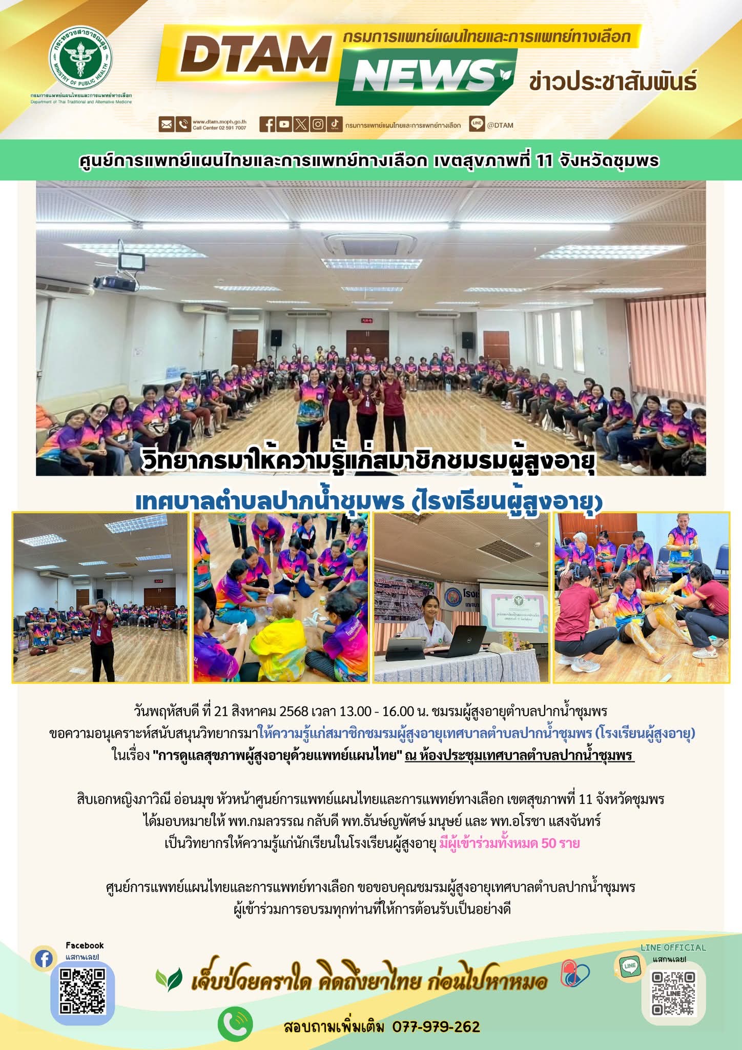 วันพฤหัสบดี ที่ 21 สิงหาคม 2568 เวลา 13.00 - 16.00 น. ชมรมผู้สูงอายุตำบลปากน้ำชุมพร ขอความอนุเคราะห์สนับสนุนวิทยากรมาให้ความรู้แก่สมาชิกชมรมผู้สูงอายุเทศบาลตำบลปากน้ำชุมพร (โรงเรียนผู้สูงอายุ) ในเรื่อง "การดูแลสุขภาพผู้สูงอายุด้วยแพทย์แผนไทย" ณ ห้องประชุมเทศบาลตำบลปากน้ำชุมพร สิบเอกหญิงภาวิณี อ่อนมุข หัวหน้าศูนย์การแพทย์แผนไทยและการแพทย์ทางเลือก เขตสุขภาพที่ 11 จังหวัดชุมพร ได้มอบหมายให้ พท.กมลวรรณ กลับดี พท.ธันษ์ญพัศษ์ มนุษย์ และ พท.อโรชา แสงจันทร์ เป็นวิทยากรให้ความรู้แก่นักเรียนในโรงเรียนผู้สูงอายุ มีผู้เข้าร่วมทั้งหมด 50 ราย