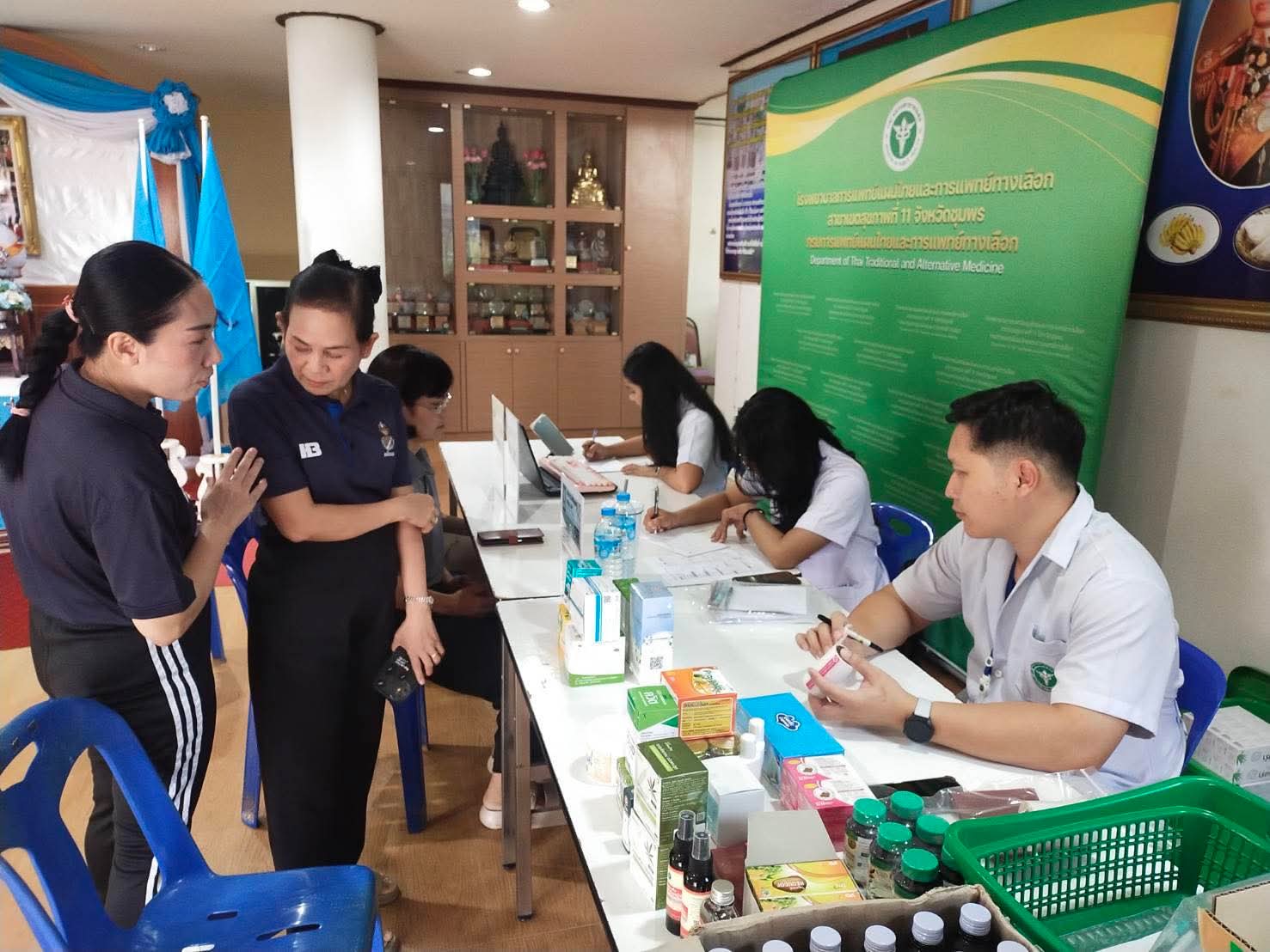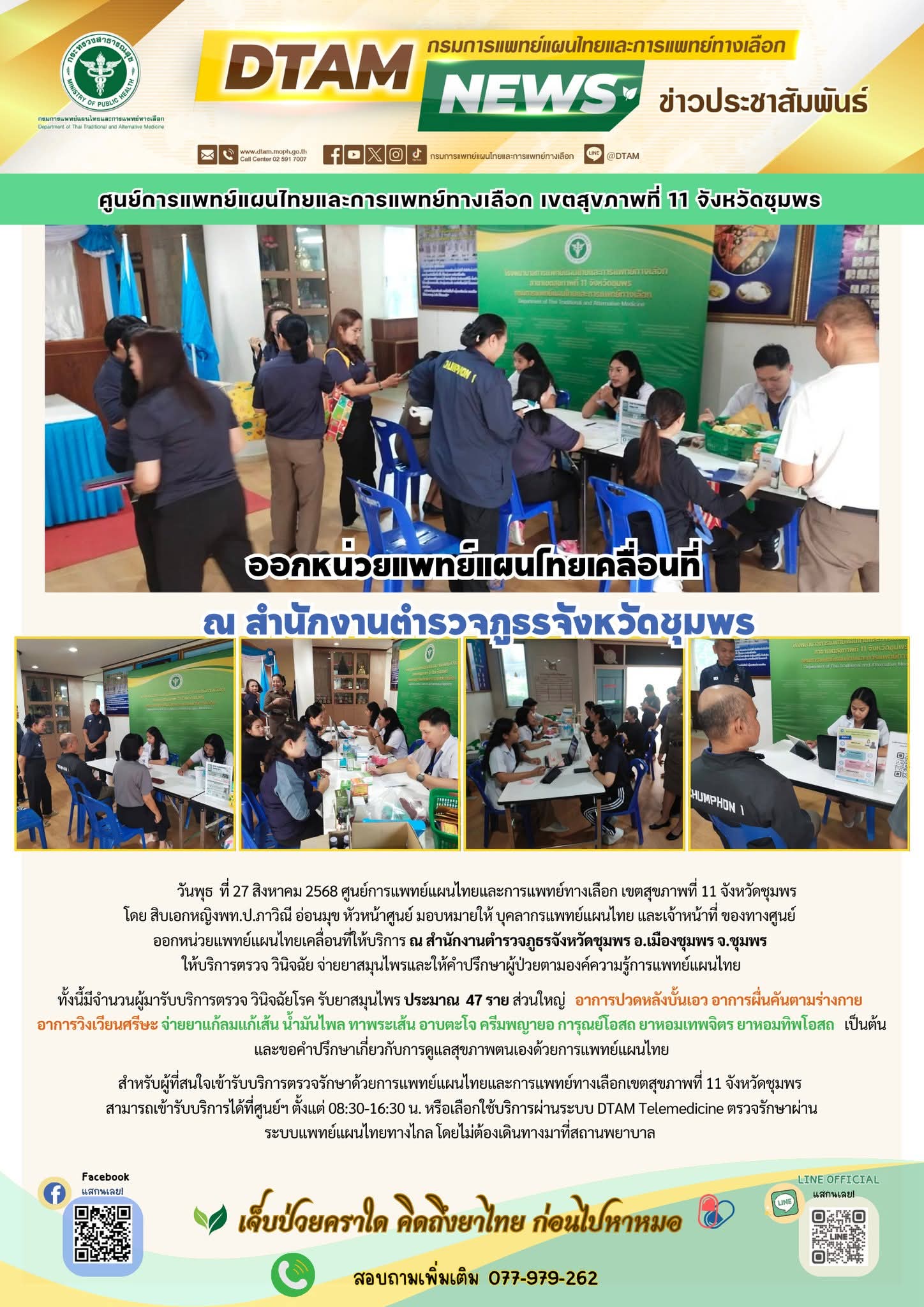 วันพุธ ที่ 27 สิงหาคม 2568 ศูนย์การแพทย์แผนไทยและการแพทย์ทางเลือก เขตสุขภาพที่ 11 จังหวัดชุมพร โดย สิบเอกหญิงพท.ป.ภาวิณี อ่อนมุข หัวหน้าศูนย์ มอบหมายให้ บุคลากรแพทย์แผนไทย และเจ้าหน้าที่ ของทางศูนย์ ออกหน่วยแพทย์แผนไทยเคลื่อนที่ให้บริการ ณ สำนักงานตำรวจภูธรจังหวัดชุมพร อ.เมืองชุมพร จ.ชุมพร ให้บริการตรวจ วินิจฉัย จ่ายยาสมุนไพรและให้คำปรึกษาผู้ป่วยตามองค์ความรู้การแพทย์แผนไทย ทั้งนี้มีจำนวนผู้มารับบริการตรวจ วินิจฉัยโรค รับยาสมุนไพร ประมาณ 47 ราย ส่วนใหญ่ อาการปวดหลังบั้นเอว อาการผื่นคันตามร่างกาย อาการวิงเวียนศรีษะ จ่ายยาแก้ลมแก้เส้น น้ำมันไพล ทาพระเส้น อาบตะโจ ครีมพญายอ การุณย์โอสถ ยาหอมเทพจิตร ยาหอมทิพโอสถ เป็นต้น และขอคำปรึกษาเกี่ยวกับการดูแลสุขภาพตนเองด้วยการแพทย์แผนไทย