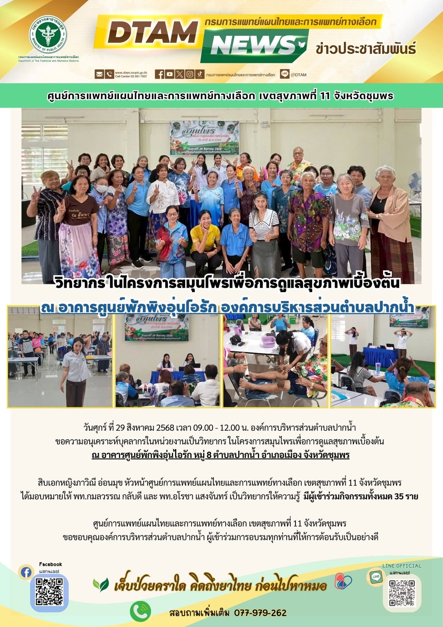 วันศุกร์ ที่ 29 สิงหาคม 2568 เวลา 09.00 - 12.00 น. องค์การบริหารส่วนตำบลปากน้ำ ขอความอนุเคราะห์บุคลากรในหน่วยงานเป็นวิทยากร ในโครงการสมุนไพรเพื่อการดูแลสุขภาพเบื้องต้น ณ อาคารศูนย์พักพิงอุ่นไอรัก หมู่ 8 ตำบลปากน้ำ อำเภอเมือง จังหวัดชุมพร สิบเอกหญิงภาวิณี อ่อนมุข หัวหน้าศูนย์การแพทย์แผนไทยและการแพทย์ทางเลือก เขตสุขภาพที่ 11 จังหวัดชุมพร ได้มอบหมายให้ พท.กมลวรรณ กลับดี และ พท.อโรชา แสงจันทร์ เป็นวิทยากรให้ความรู้ มีผู้เข้าร่วมกิจกรรมทั้งหมด 35 ราย
