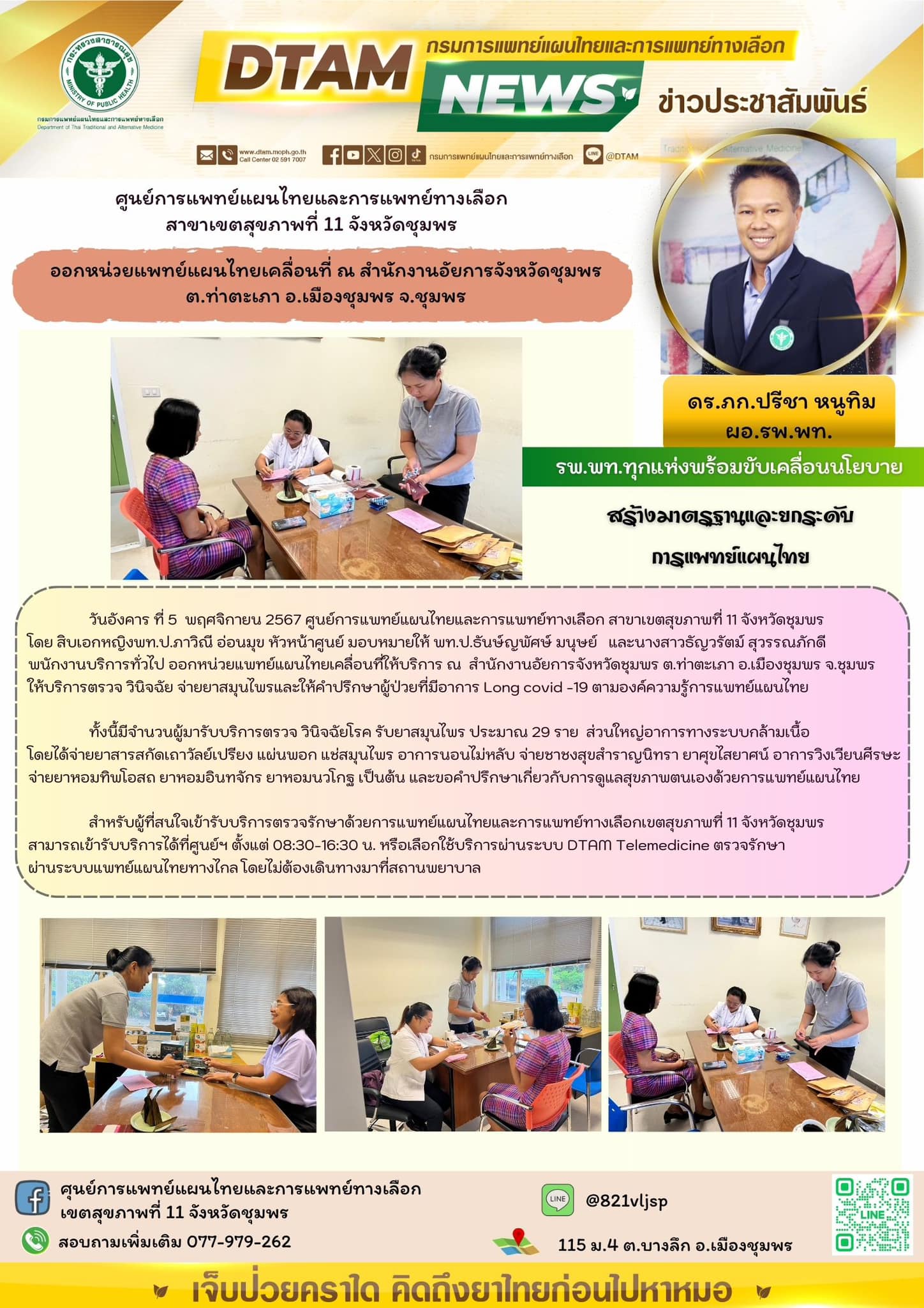 วันอังคาร ที่ 5 พฤศจิกายน 2567 ศูนย์การแพทย์แผนไทยและการแพทย์ทางเลือก สาขาเมตสุขภาพที่ 11 จังหวัดชุมพร โดย สิบเอกหญิงพท.ป.ภาวิณี อ่อนมุข หัวหน้าศูนย์ มอบหมายให้ พท.ป.ธัมษ์ญพัศษ์ มนุษย์ และนางสาวธัญวรัตม์ สุวรรณภักดิ์ พนักงานบริการทั่วไป ออกหน่วยแพทย์แผนไทยเคลื่อนที่ให้บริการ ณ สำนักงานอัยการจังหวังหวัดชุมพร ต.ท่าตะเภา อ.เมืองชุมพร จ.ชุมพร ให้บริการตรวจ วินิจฉัย จ่ายยาสมุนไพรและให้คำปรึกษาผู้ป่วยที่มีอาการ Long covid -19 ตามองค์ความรู้การแพทย์แผนไทย ทั้งนี้มีจำนวนผู้มารับบริการตรวจ วินิจฉัยโรค รับยาสมุนไพร ประมาณ 29 ราย ส่วนใหญ่อาการทางระบบกล้ามเนื้อ โดยได้จ่ายยาสารสกัดเถาวัลย์เปรียง แผ่นพอก แช่สมุนไพร อาการบอนไม่หลับ จ่ายชาชงสุขสำราญนิทรา ยาศุขไสยาศน์ อาการวิงเวียนศีรษะ จ่ายยาหอมทิพโอสถ ยาหอมอินทจักร ยาหอมนวโกฐ เป็นต้น และขอคำปรึกษาเกี่ยวกับการดูแลสุขภาพตนเองด้วยการแพทย์แผนไทย