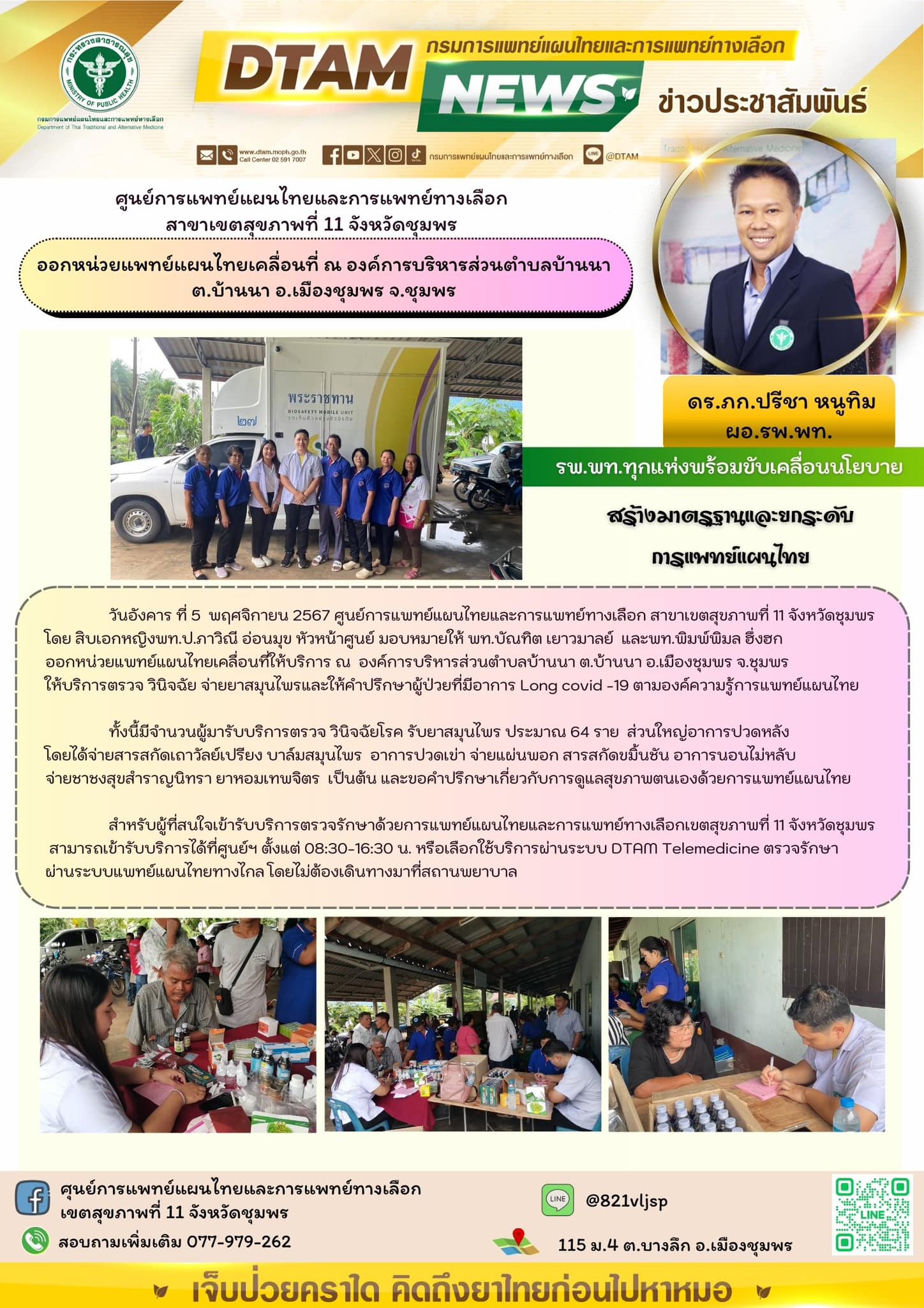 วันอังคาร ที่ 5 พฤศจิกายน 2567 ศูนย์การแพทย์แผนไทยและการแพทย์ทางเลือก สายาเขตสุขภาพที่ 1 จังหวัดชุมพร โดย สิบเอกหญิงพท.ป.ภาวิณี อ่อนมุข หัวหน้าศูนย์ มอบหมายให้ พท.บัณฑิต เยาวมาลย์ และพท.พิมพ์พิมล ฮึ่งฮก ออกหน่วยแพทย์แผนไทยเคลื่อนที่ให้บริการ ณ องค์การบริหารส่วนตำบลบ้านนา ต.บ้านนา อ.เมืองชุมพร จ.ชุมพร ให้บริการตรวจ วินิจฉัย จ่ายยาสมุนไพรและให้คำปรึกษาผู้ป่วยที่มีอาการ Long covid-19 ตามองค์ความรู้การแพทย์แผนไทย ทั้งนี้มีจำนวนผู้มารับบริการตรวจ วินิจฉัยโรค รับยาสมุนไพร ประมาณ 64 ราย ส่วนใหญ่อาการปวดหลัง โดยได้จ่ายสารสกัดเถาวัลย์เปรียง บาล์มสมุนไพร อาการปวดเข่า จ่ายแผ่นพอก สารสกัดขมิ้นชั้น อาการนอนไม่หลับ จ่ายชาชงสุขสำราญนิทรา ยาหอมเทพจิตร เป็นต้น และขอคำปรึกษาเกี่ยวกับการดูแลสุขภาพตนเองด้วยการแพทย์แผนไทย