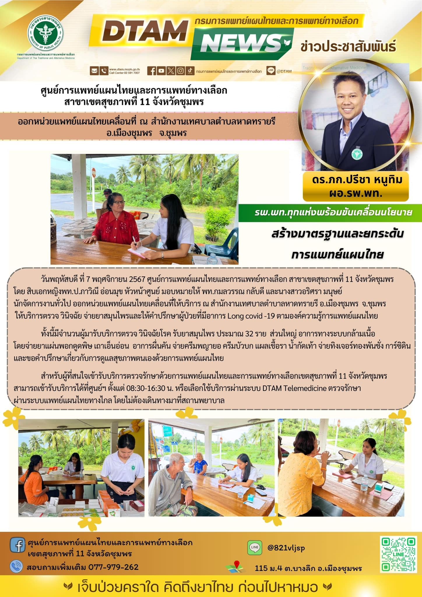 วันพฤหัสบดี ที่ 7 พฤศจิกายน 2567 ศูนย์การแพทย์แผนไทยและการแพทย์ทางเลือก สาขาเขตสุขภาพที่ 11 จังหวัดชุมพร โดย สิบเอกหญิงพท.ป.ภาวิณี อ่อนมุข หัวหน้าศูนย์ มอบหมายให้ พท.กมลวรรณ กลับดี และนางสาวอริศรา มนุษย์ นักจัดการงานทั่วไป ออกหน่วยแพทย์แผนไทยเคลื่อนที่ให้บริการ ณ สำนักงานเทศบาลตำบลหาดทรายรี อ.เมืองชุมพร จ.ชุมพร ให้บริการตรวจ วินิจฉัย จ่ายยาสมุนไพรและให้คำปรึกษาผู้ป่วยที่มีอาการ Long covid-19 ตามองค์ความรู้การแพทย์แผนไทย ทั้งนี้มีจำนวนผู้มารับบริการตรวจ วินิจฉัยโรค รับยาสมุนไพร ประมาณ 32 ราย ส่วนใหญ่ อาการทางระบบกล้ามเนื้อ โดยจ่ายยาแผ่นพอกดูดพิษ เถาเอ็นอ่อน อาการผื่นคัน จ่ายครีมพญายอ ครีมบัวบก แผลเชื้อรา น้ำกัดเท้า จ่ายทิงเจอร์ทองพันชั่ง การ์ซิดิน และขอคำปรึกษาเกี่ยวกับการดูแลสุขภาพตนเองด้วยการแพทย์แผนไทย